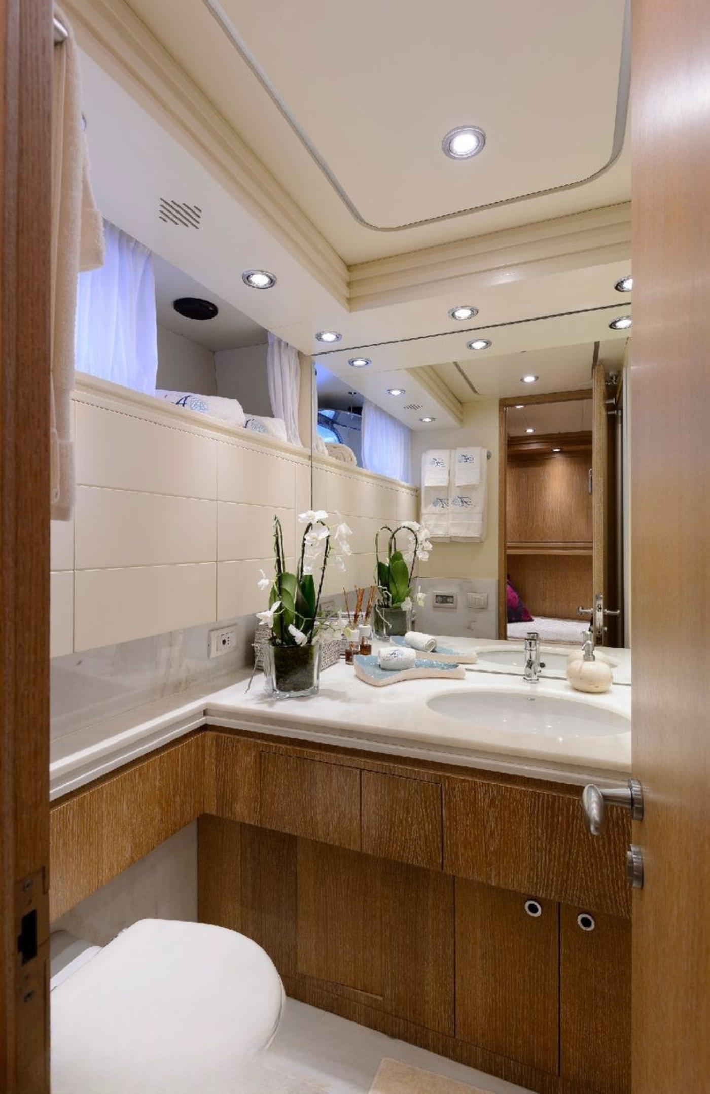 All staterooms are complete with their own en-suite bathrooms adorned with Italian marble. The vast owner stateroom features elegant decor with a king size bed, wide screen TV, large closets and ensuite bathroom with shower and Jacuzzi. The 2 VIP aft cabins both feature TV and ensuite bathroom with shower.