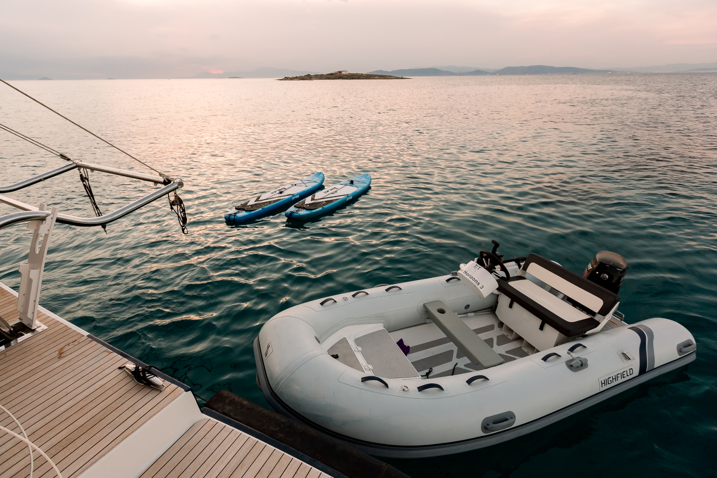 One full Master Stateroom, One VIP cabin, One Queen cabin, One Double and One Twin. All with private facilities and separate plexiglass showers. Tender & Toys