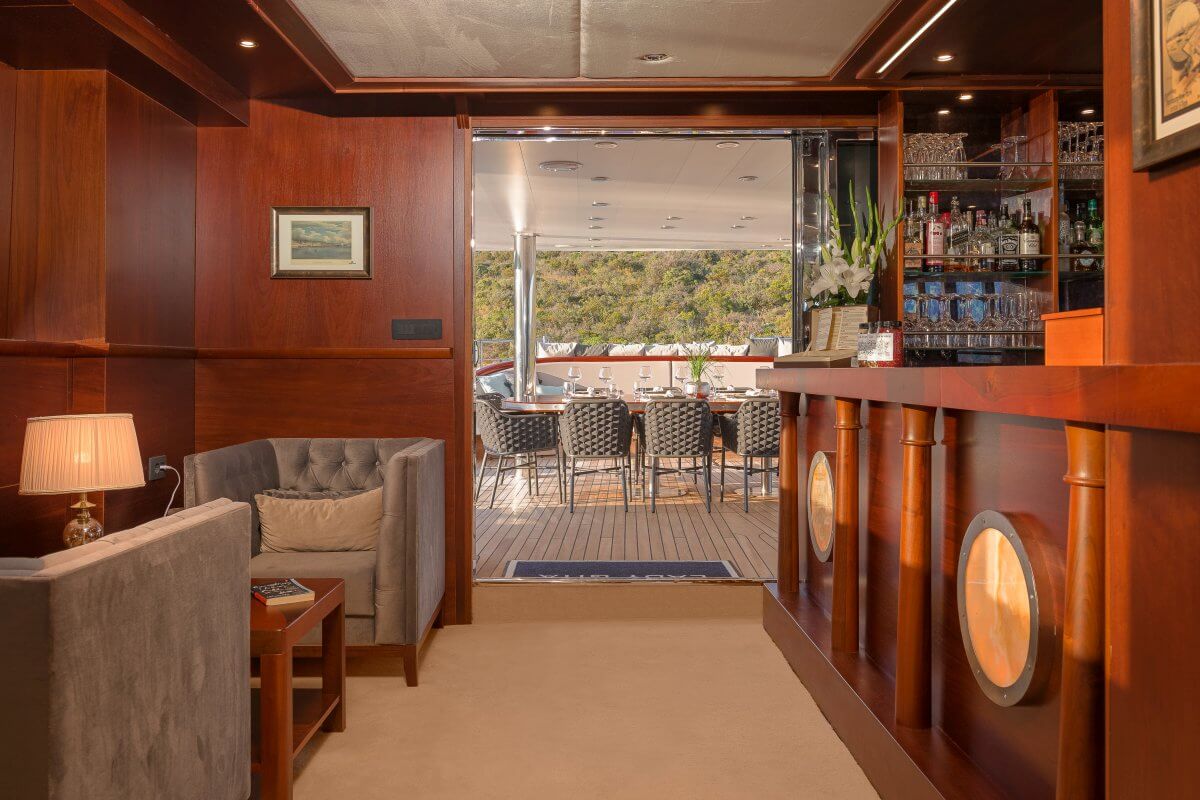 Two levels provide shade, alfresco dining, seating and sunning areas. On her sundeck, there is a jacuzzi. Two king cabins and 4 queen cabins, accommodate up to 12 charter guests. Tender and Toys