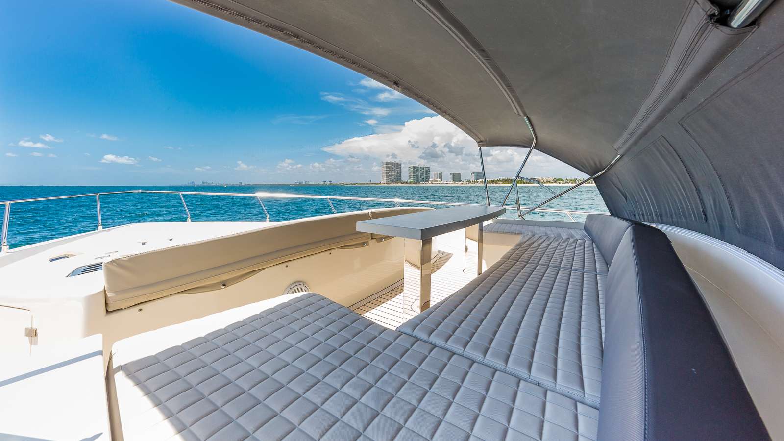 A stairway to port and starboard leads up to the main deck aft, where a sofa follows the curve of the stern and a raised table with additional seating for comfortable alfresco dining.