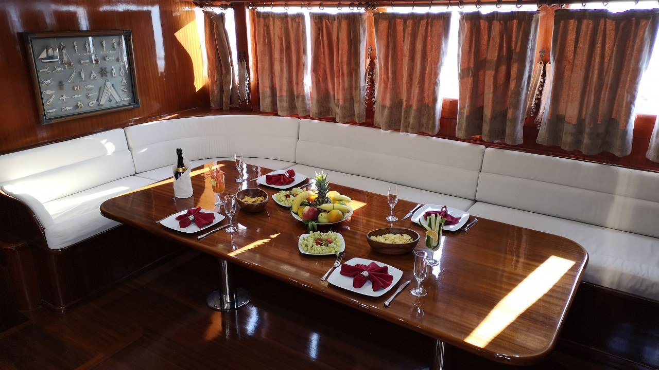 The yacht interior is relaxing, with a contemporary atmosphere, featuring traditional warm woods and neutral furnishings.
