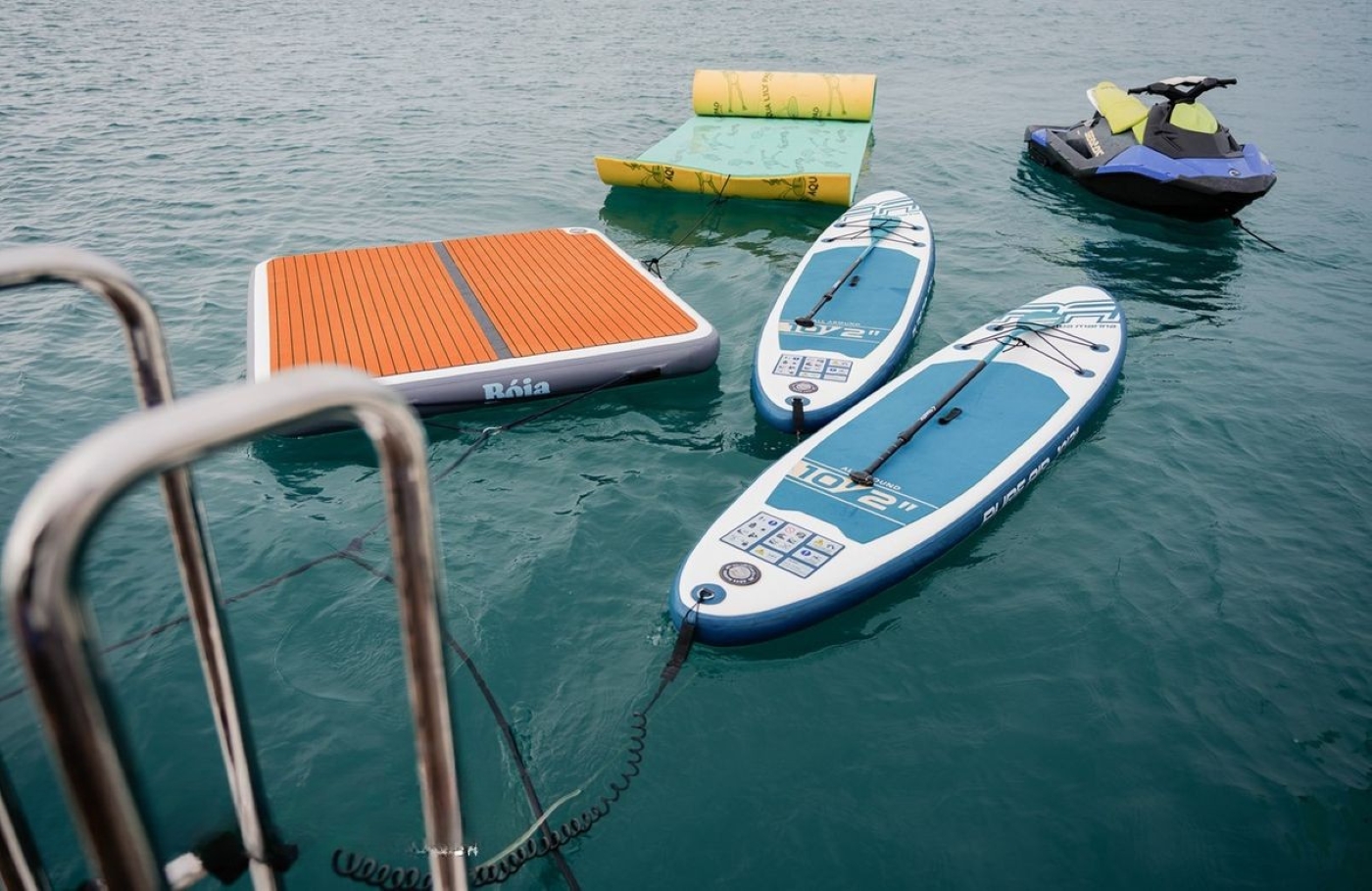 NOTABLE FEATURES OF RASCAL: ~Flybridge Jacuzzi ~Spacious outdoor sunbathing areas ~Purpose-built 6m x 3m inflatable air deck ~Extensive variety of water toys ~Range of 2,000 nautical miles ~Air conditioning ~Wi-Fi