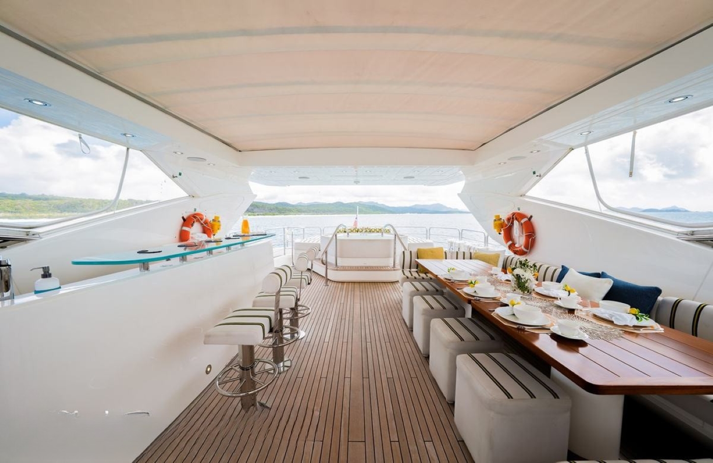 The shaded cockpit is fitted with a wet bar with three stools, while two L-shaped sofas each with a coffee table are placed out in the sunshine along the stern.