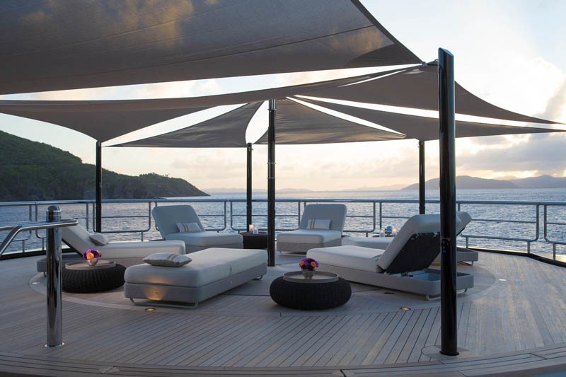 Sofas in the sunshine and shade are placed along the sides and aft to provide for large guest numbers at dockside events.