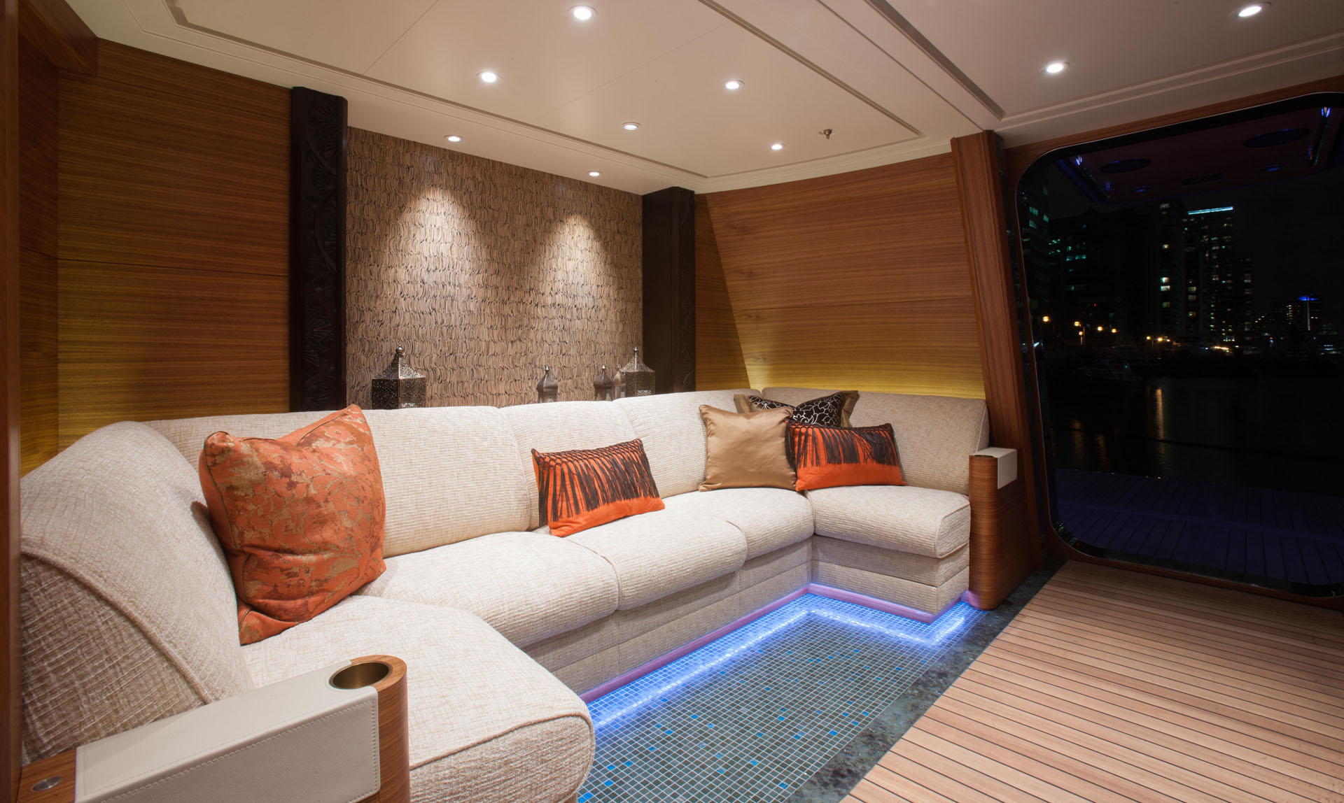 Guests arriving by tender can ascend the staircase to starboard or access the lower deck swim platform from which there is access into the beach club or up the stairways to the main deck aft. Here, there are curving sofas to port ...