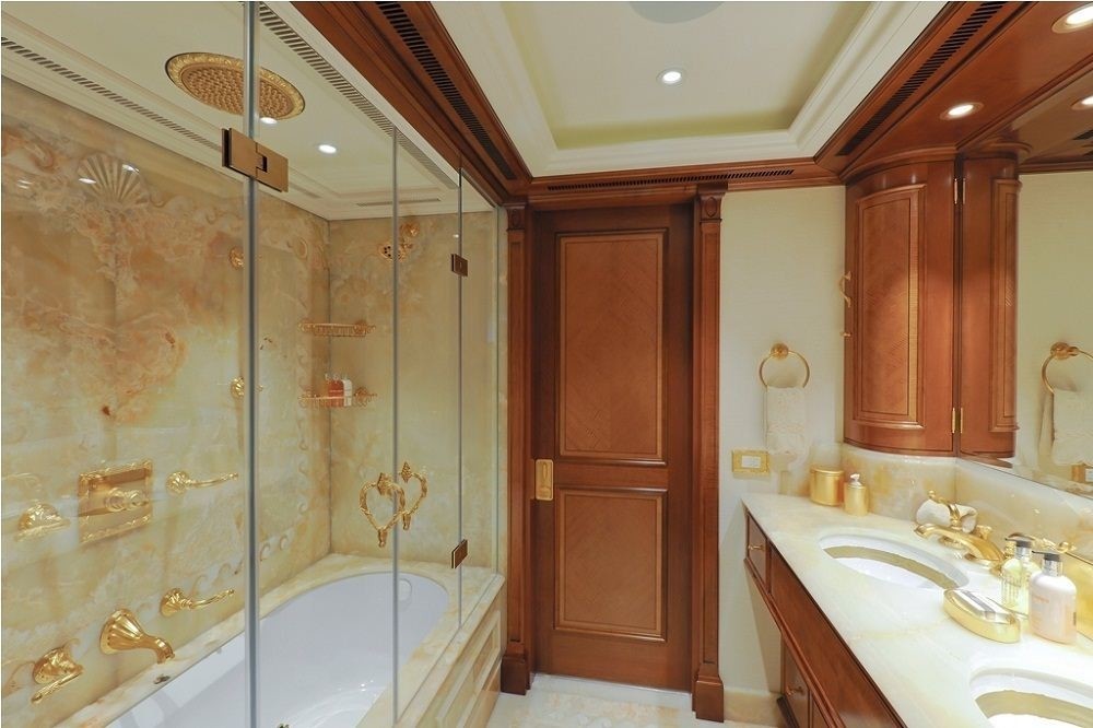A final lounge with floor-to-ceiling windows and glass sliding doors is aft of the dance room.
