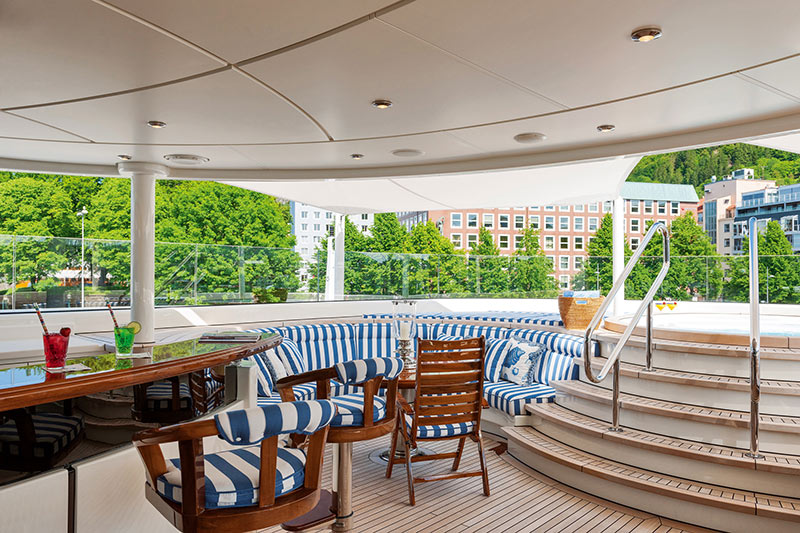 The bridge deck aft is furnished with a wet bar, a large alfresco dining table and ...