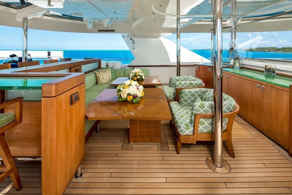 Within, the forward formal dining area provides a stately space for up to 12 to dine. Behind, the salon placed an L-shaped sofa to port and a second sofa to starboard, both with a lacquered coffee table for casual drinks or ...