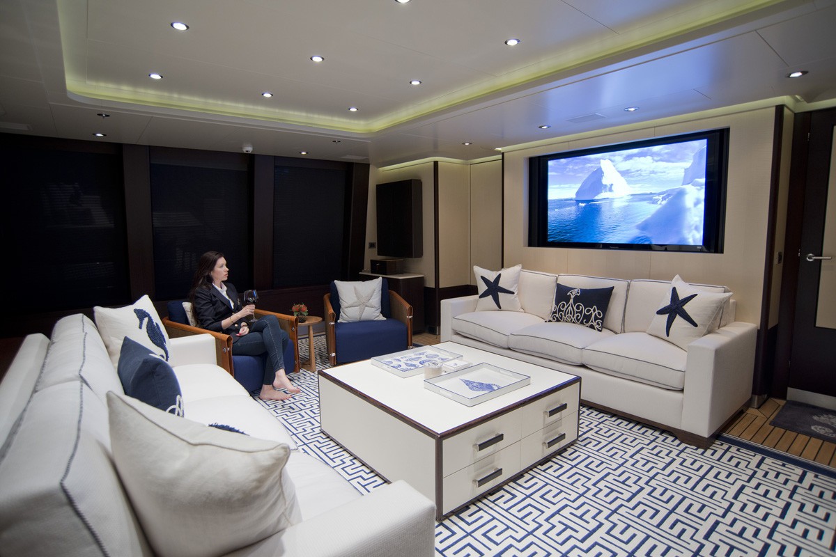 The bedroom is furnished with a desk in front of one window and a day bed beneath the other, and more light comes through the retractable ceiling panel above the bed. The VIP stateroom is placed on the upper deck and treats its occupants to a desk and sofa close to the windows, as well as an en-suite bathroom.
