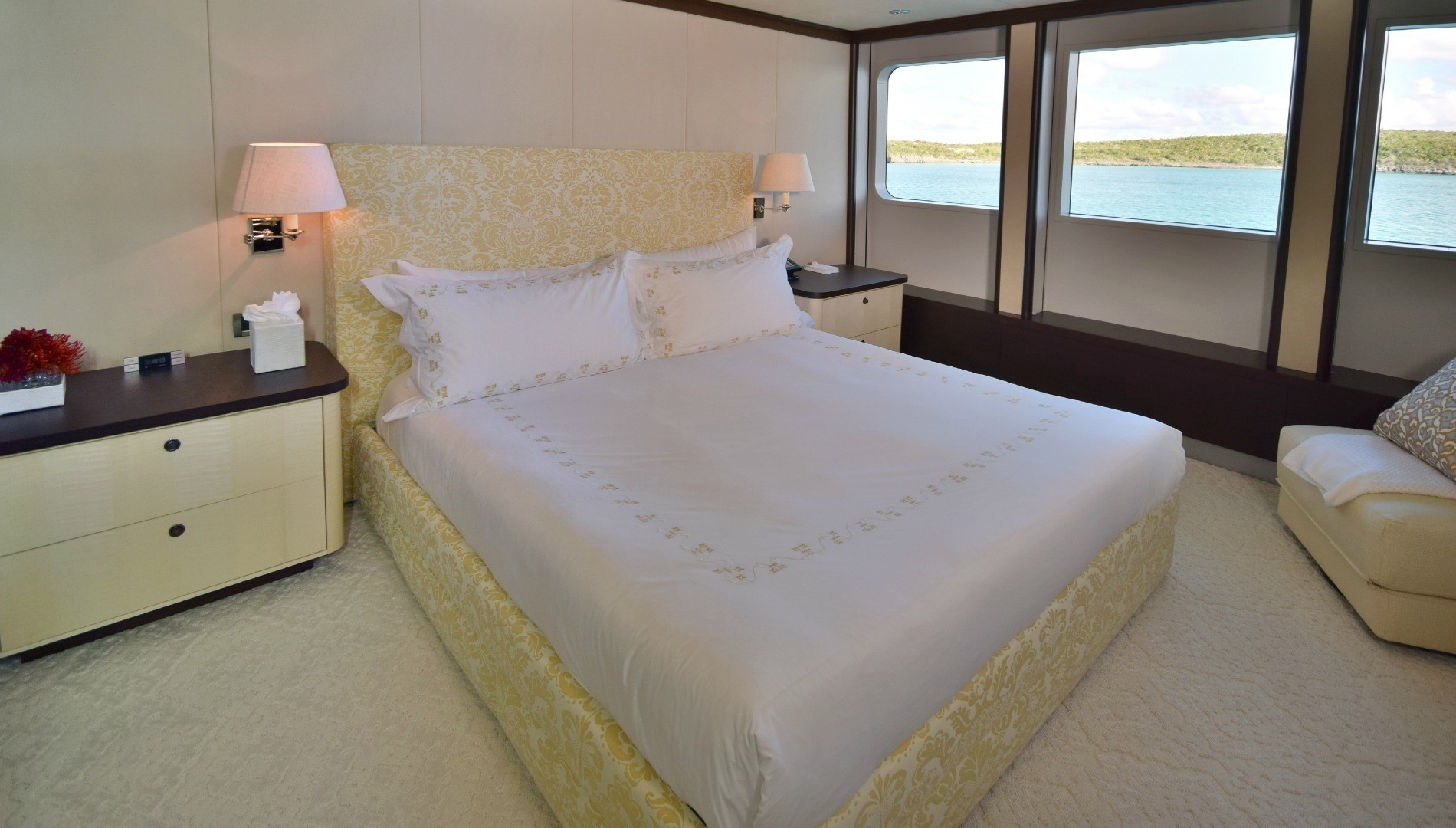 On the main deck, the Master suite is placed forward and contains an en-suite bathroom with a massive Jacuzzi tub. The bedroom is furnished with a desk in front of one window and a day bed beneath the other, and more light comes ...