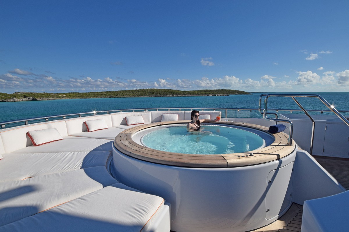 The sundeck has two L-shaped sofas and a coffee table to the aft, with the central area offering gym equipment for an alfresco workout.