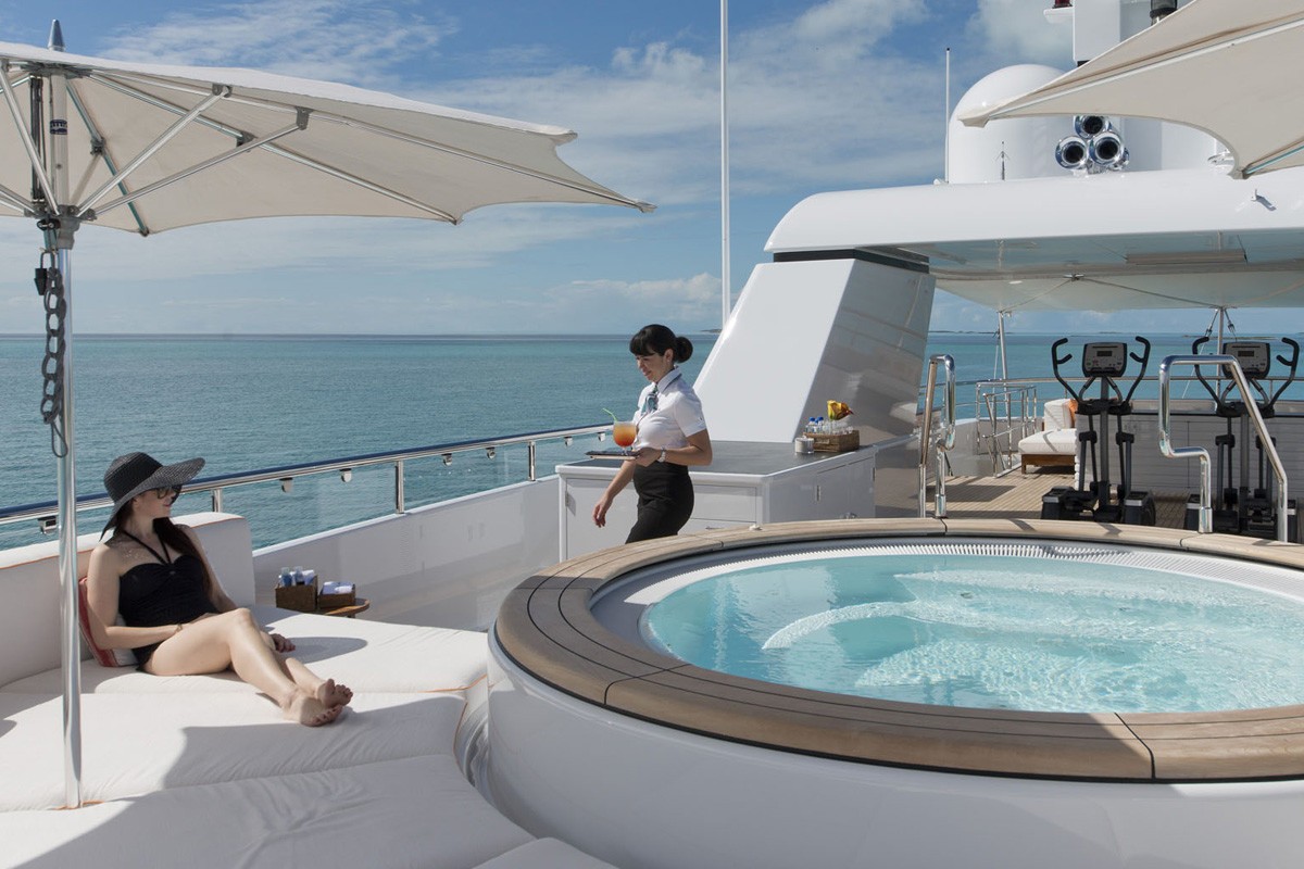 The cabinetry behind stores an excellent of spirits, which can be used to complement a meal out on the upper deck aft.
