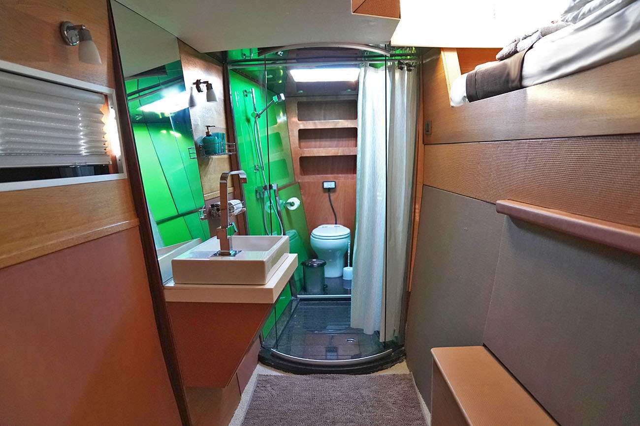 The galley allows guests to watch their meal being prepared in front of them and contains a wet bar and barbeque grill. Along the stern, a staircase leads down each hull for easy access in and out of the water.