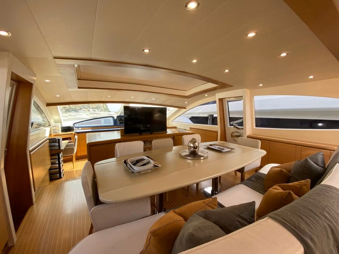 On the flybridge, the helm station controls are placed forward and to starboard, behind which is a sofa for guests to rest in the sunshine and take in the views.
