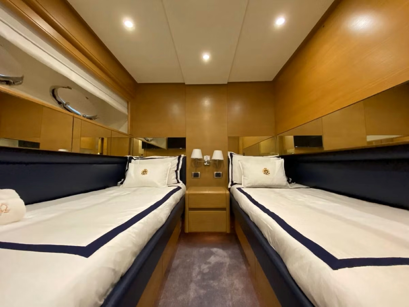 She sleeps up to 10 guests over four en-suite cabins and a crew of three for a professional yet discreet service.