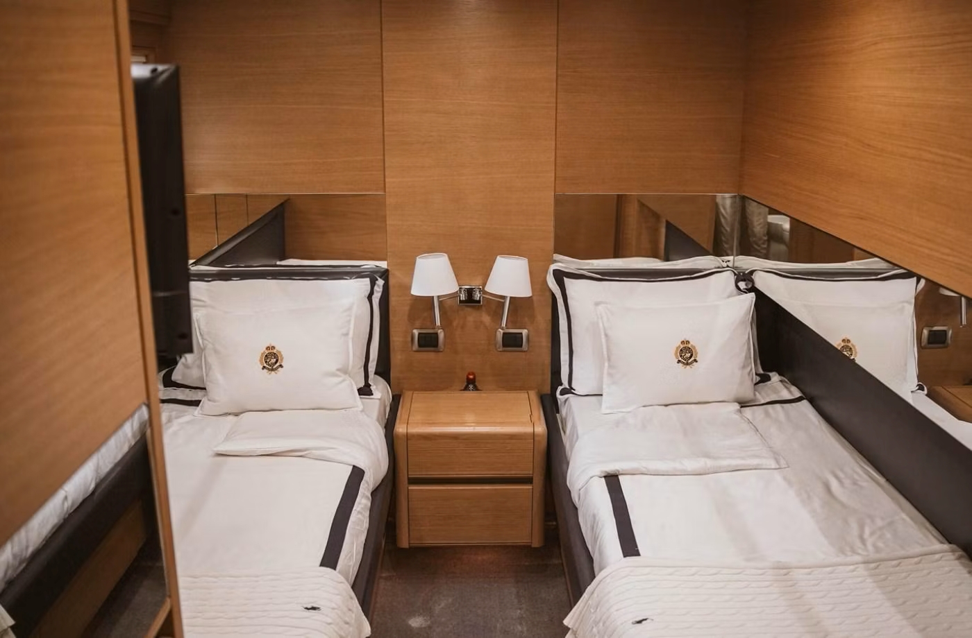 She sleeps up to 10 guests over four en-suite cabins and a crew of three for a professional yet discreet service.