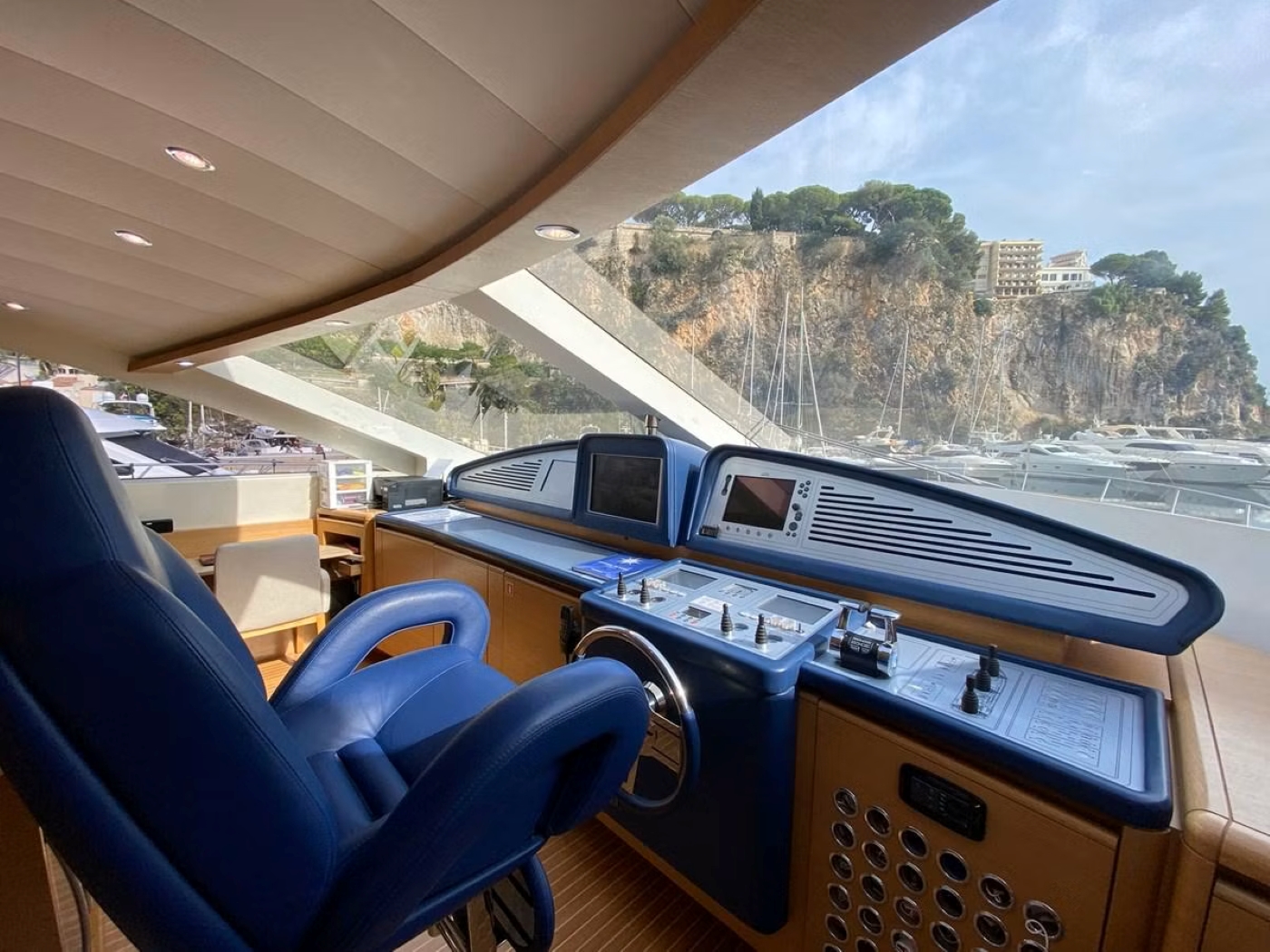 Behind the lower salon is the VIP stateroom to port, the crew accommodation and galley to starboard and the engine room is in the stern.
