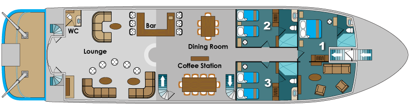 Featuring a clean and calm contemporary colour scheme and layout, she accommodates up to 16 guests across nine en-suite cabins and has a crew of 11 to ensure that everything runs smoothly on each incredible trip.