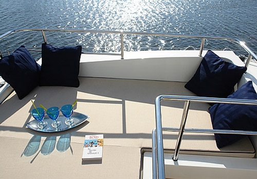 The flybridge above is a favourite spot for dining while at anchor or for relaxing on the comfortable seating while cruising in the Caribbean or Mediterranean while on charter.