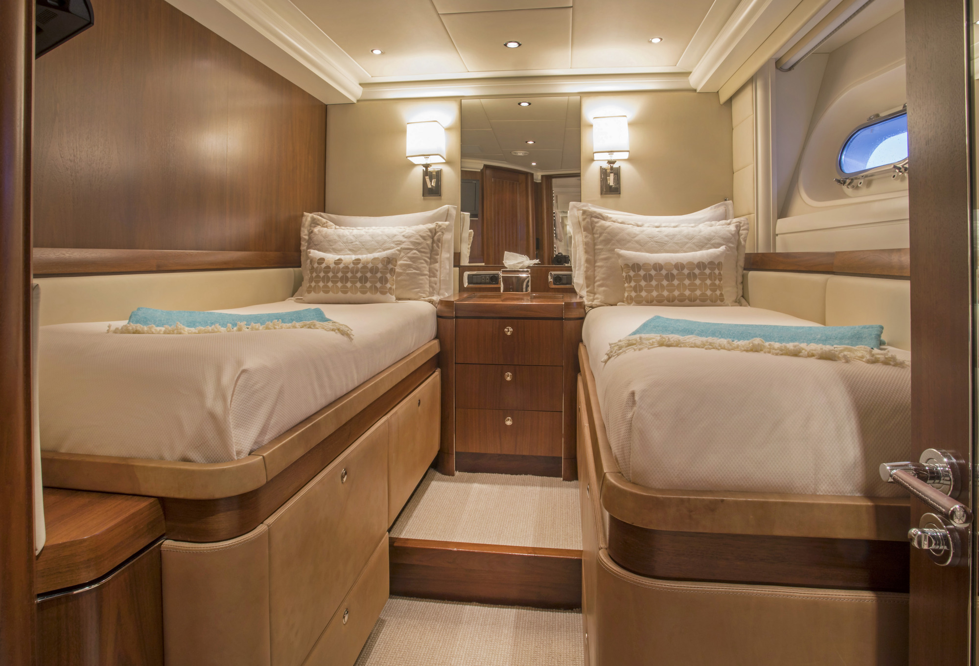 The lower deck contains the guest accommodation and the full-beam Master suite is placed amidships and has its own sofa, audio and visual entertainment systems and a large en-suite bathroom. The VIP stateroom and twin cabins are ...