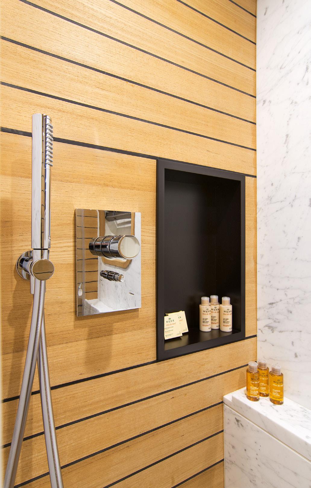 The forward en-suite bathroom contains his-and-hers sinks, a toilet and a spacious shower. ~ On the lower deck, the two double cabins are placed aft of amidships and the twin cabins forward. Each cabin has a wardrobe and an en-suite bathroom with a toilet, sink and shower.