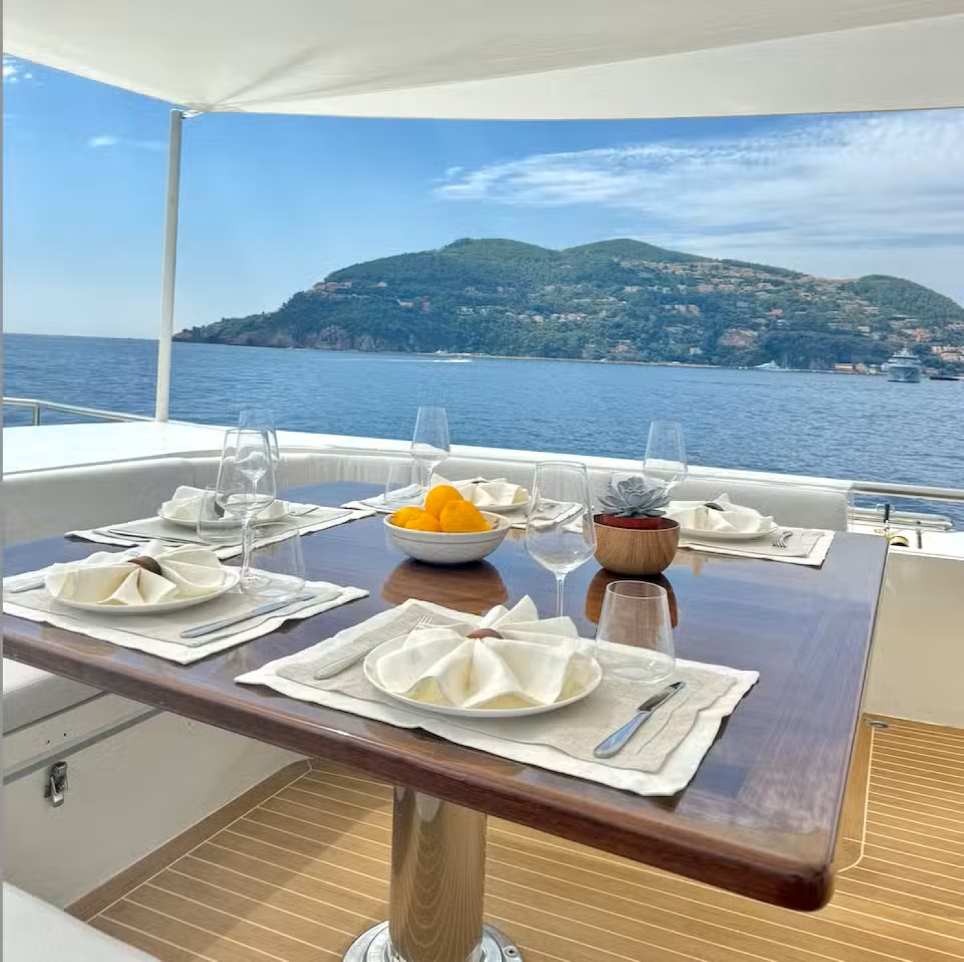 On the sundeck, there is a C-shaped sofa and raised dining table with a forward wet bar, making the ideal setting for breakfast, lunch or dinner at sunset.