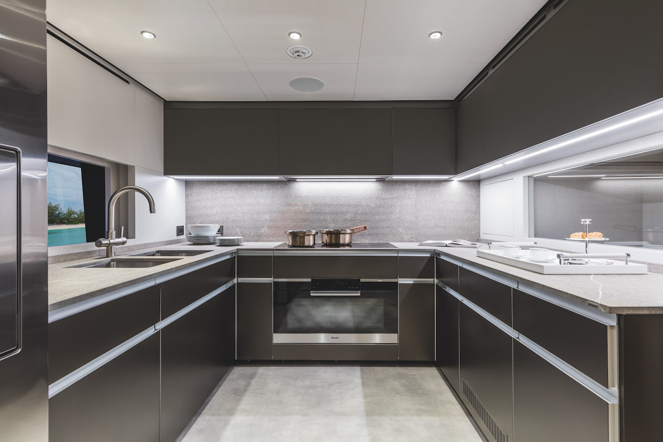 Two staircases connect up to the main deck aft, where there is a plush sofa, two armchairs, a pair of drinks tables and a coffee table for a relaxing space to socialise or have breakfast alfresco.
