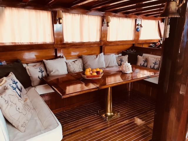 On the inside, there is a welcoming saloon with a built-in seating area and a table. Accommodation is located below decks. Twelve charter guests area accommodated across six classically styled deluxe cabins.