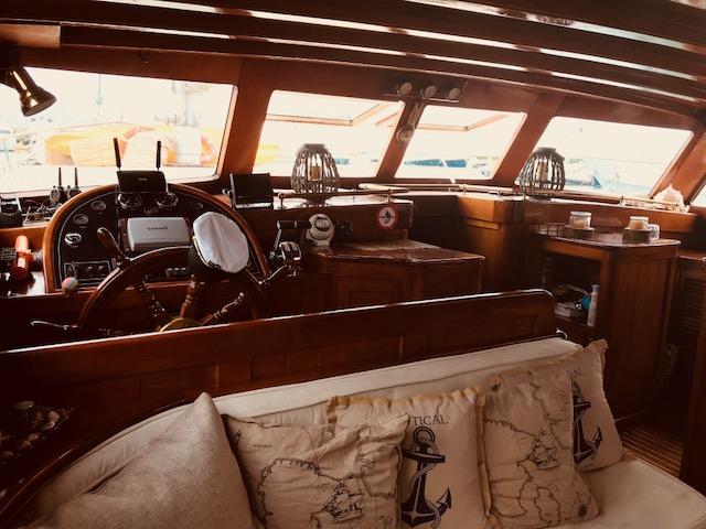 On the inside, there is a welcoming saloon with a built-in seating area and a table. Accommodation is located below decks. Twelve charter guests area accommodated across six classically styled deluxe cabins.