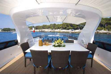 Her exterior spaces are as inviting and attractive as the interior, with the flybridge and aft area both used for al-fresco dining and general relaxation during gentle cruising.
