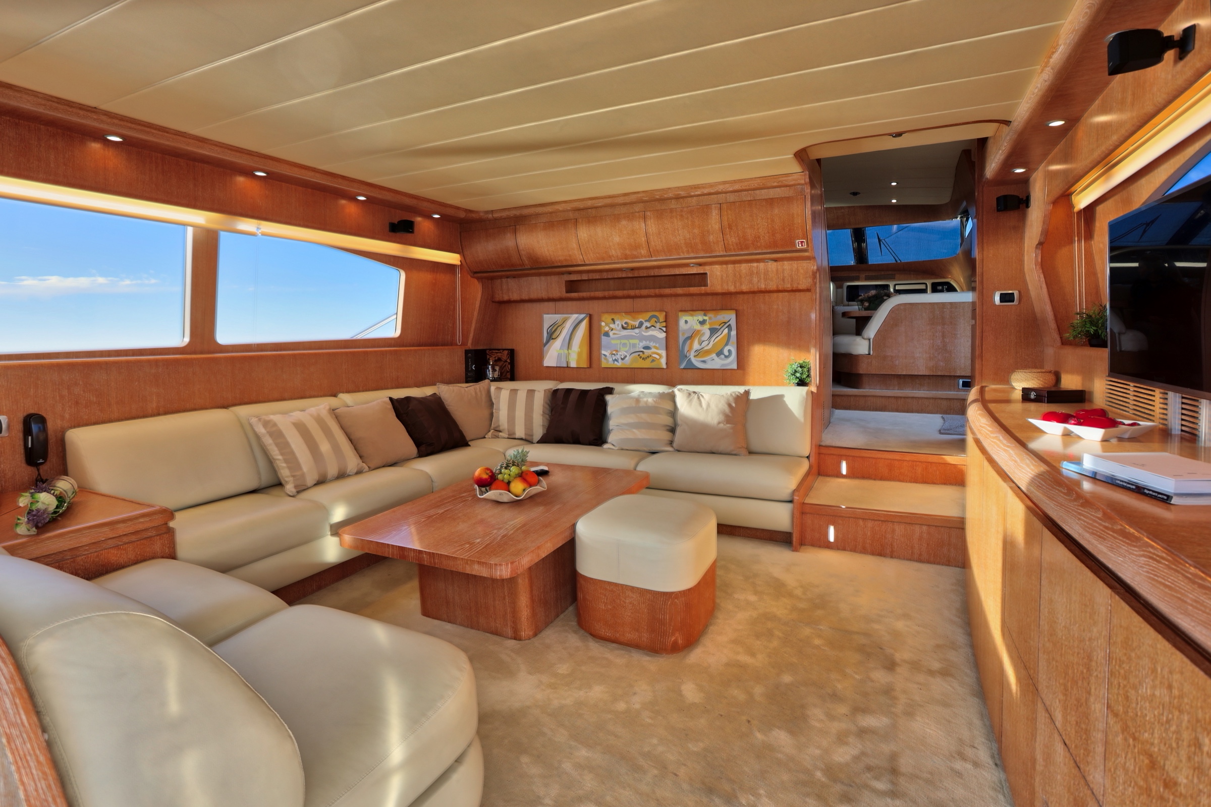 Her salon offers a sumptuous lounge with entertainment systems and fabulous natural light. This space opens out to the aft deck, where there is alfresco dining under shade. On the lower deck is a full beam master stateroom and VIP cabin, plus a twin suite.