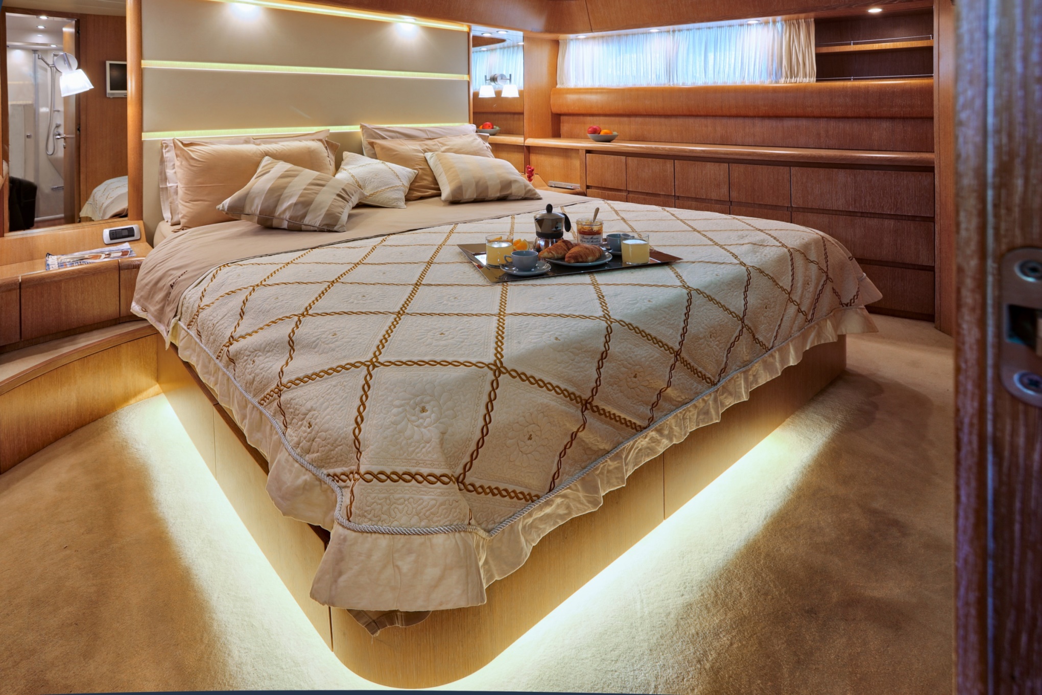 The yacht's interior is light and airy, from the main social gathering areas to the private cabins.