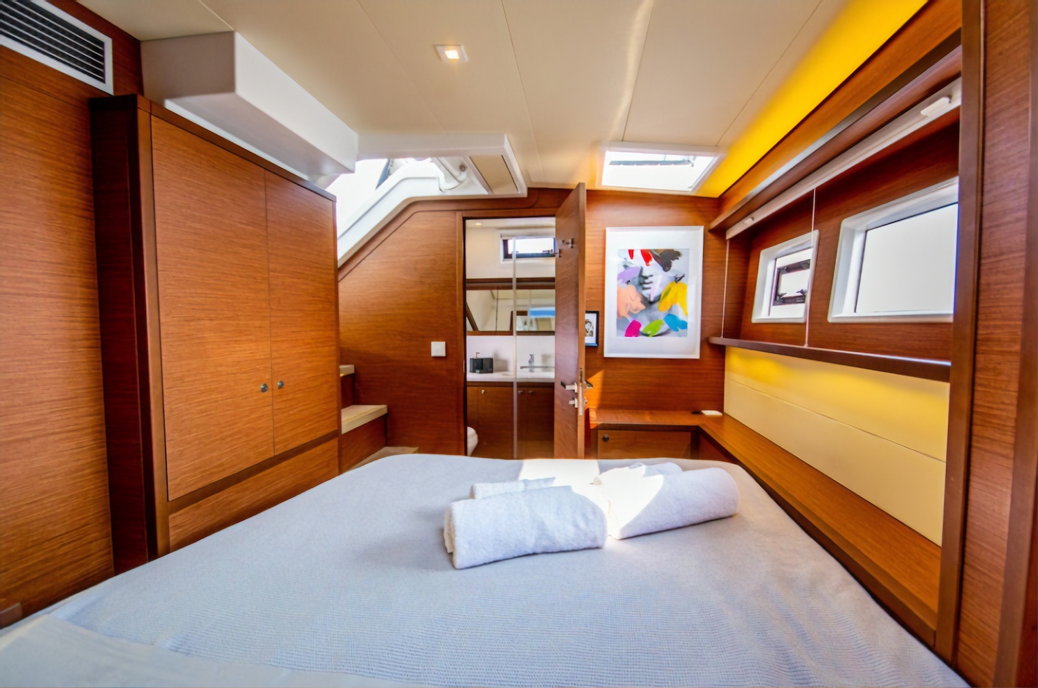 Luxury catamaran yacht ELVIRA 52 (ex VALIUM 52) is a lovely Lagoon sailing catamaran, measuring 15.85m (52’) and launched in 2019. Her spacious layout and modern interior design were created by Nauta Design, accommodating up to 10 charter guests in 5 cabins. Guests are looked after by a professional crew of 3.