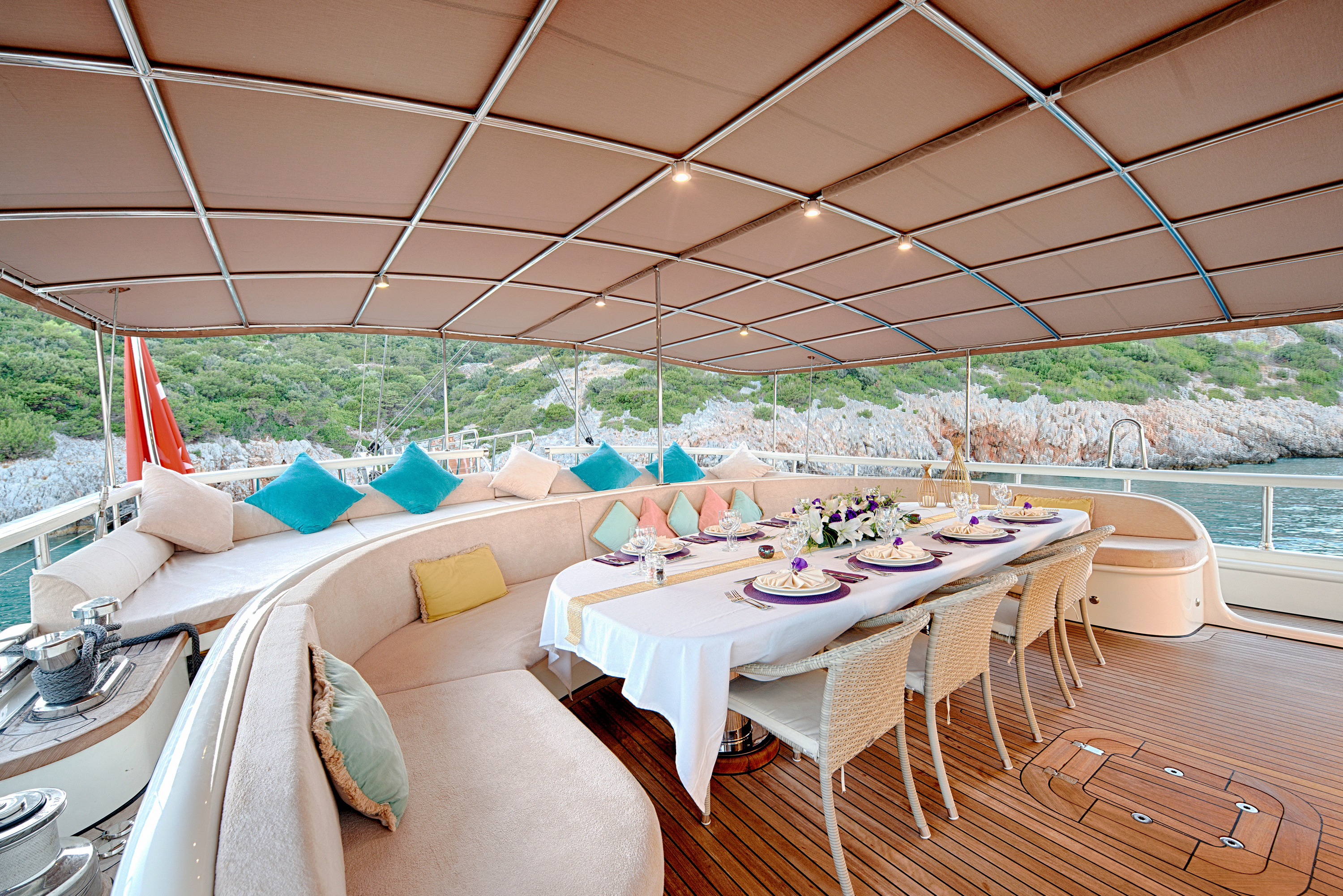 The aft section is furnished with a C-shaped sofa and movable chairs encompassing a dining table, with sun pads lining the stern for a place to nap after a delectable multi-course meal. The while section is covered by a bimini ...