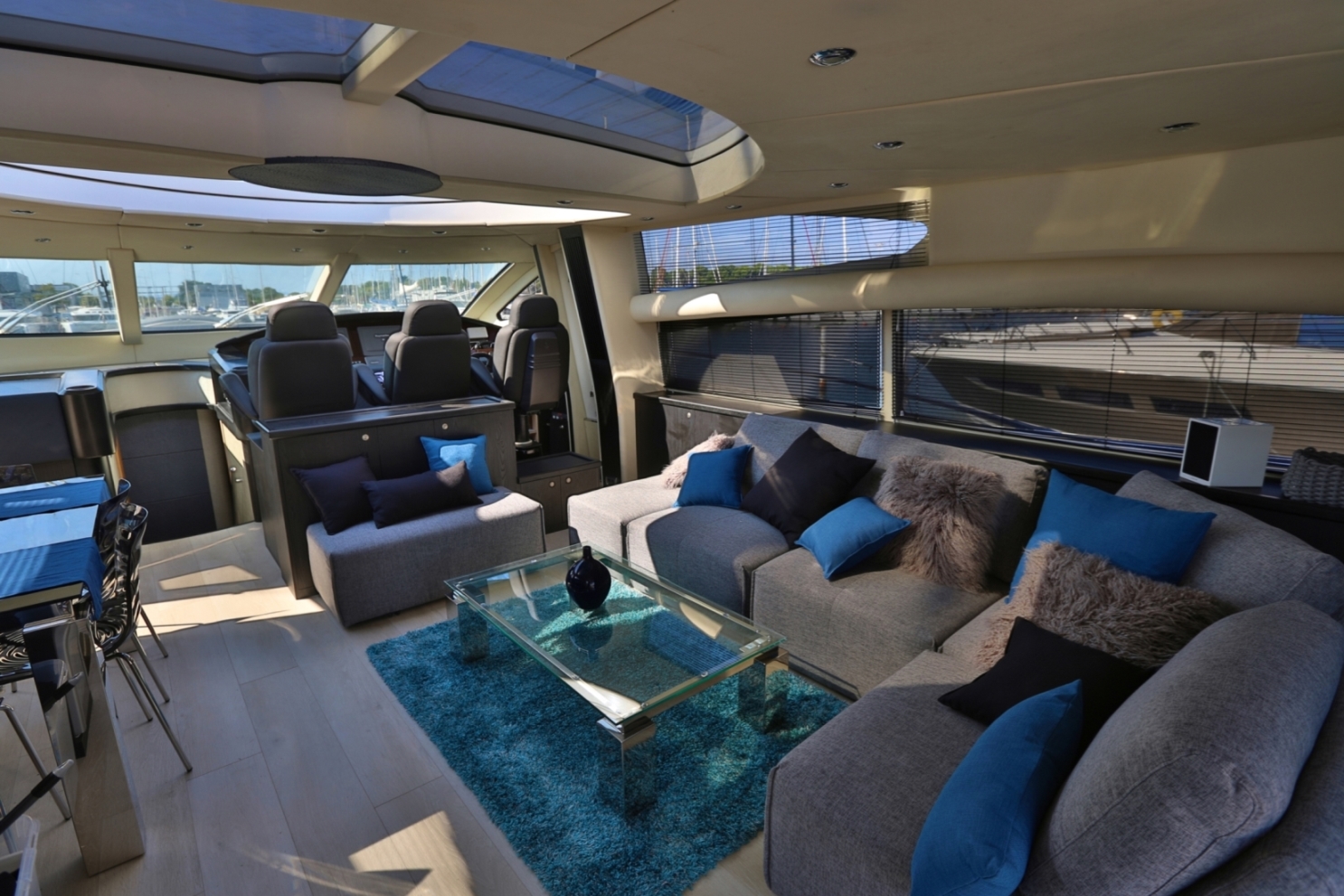 The yacht has a contemporary interior decor with soothing grey and blue tones, creating an elegant and relaxing atmosphere.