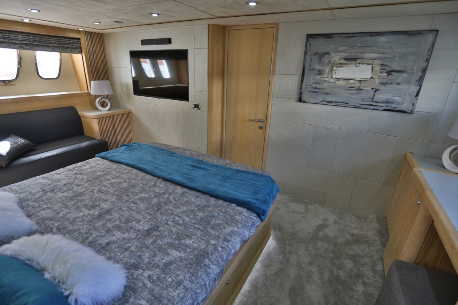 The main salon is placed in a raised position with a generous lounge, coffee table and open plan dining. Plenty of natural light streams through the elongated side windows, overhead sunroof and wide sliding glass doors aft. Steps forward lead to the lower deck and guest accommodation.