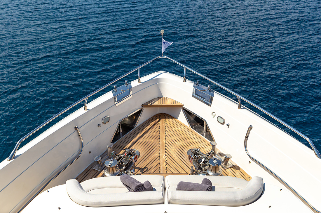 Walkways around the side lead to the foredeck, where there is a loveseat on the bow.