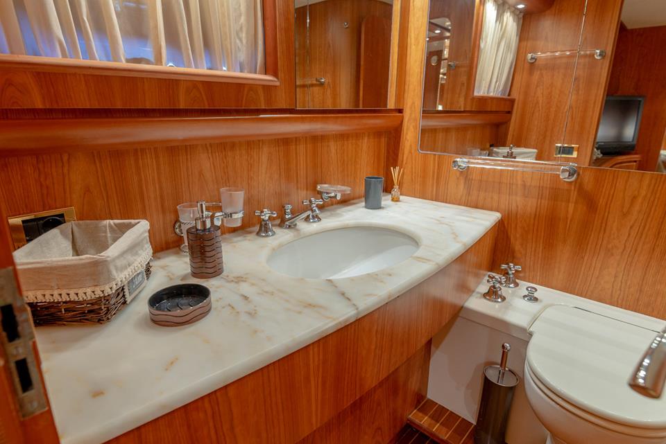 On the main deck, the pilot house is placed forward with the galley behind. The beautiful main salon takes advantage of broad windows stretching along both sides of the room for plenty of natural illumination. The elegant formal dining area is forward to starboard with a coffee table and sofa behind.