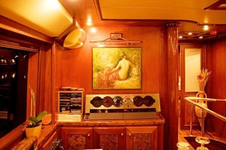 Her best feature is a spacious saloon and cockpit. The saloon has dining for eight guests and also a leather sofa. In the saloon there is also a high quality sound system and a TV and piano.