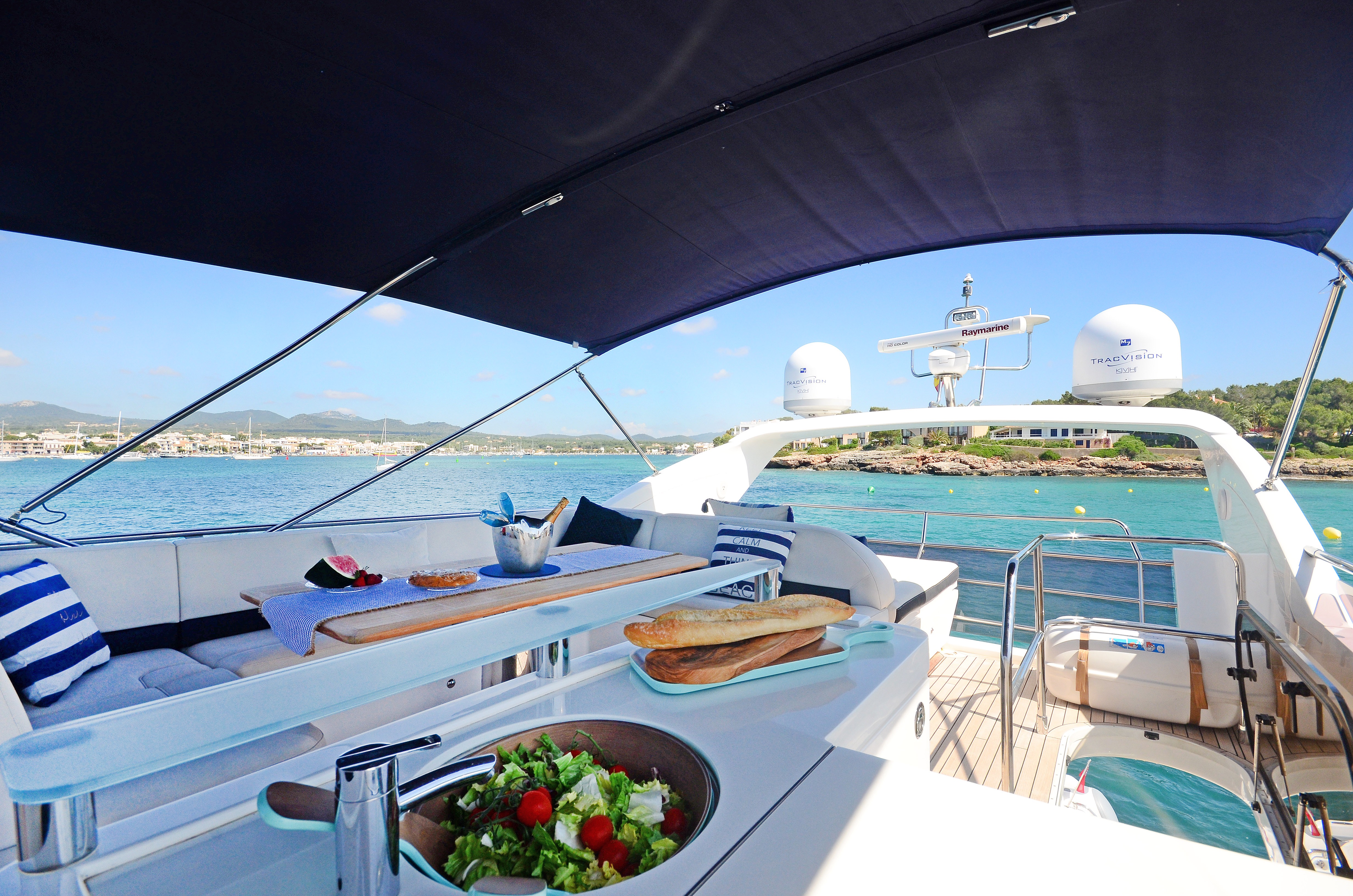 The main deck aft also has a staircase up to the flybridge, where the sun-drenched stern has sunbeds and the shaded area amidships offers a starboard alfresco dining area with a large table and plush seating surrounding three sides.