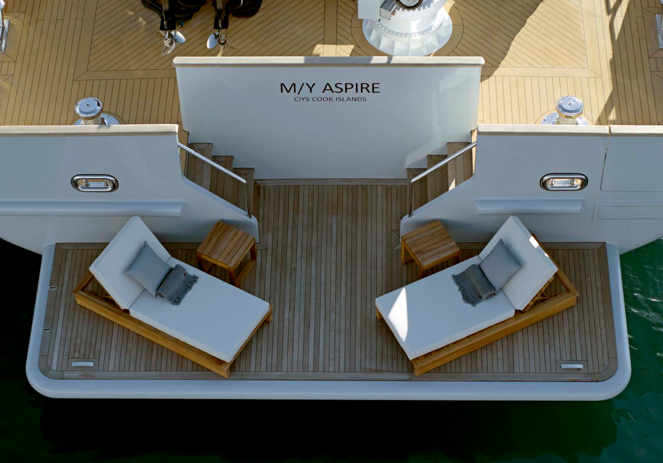 The lower deck swim platform becomes a beach club with a sun lounger to both sides creating a space to rest beside the water.