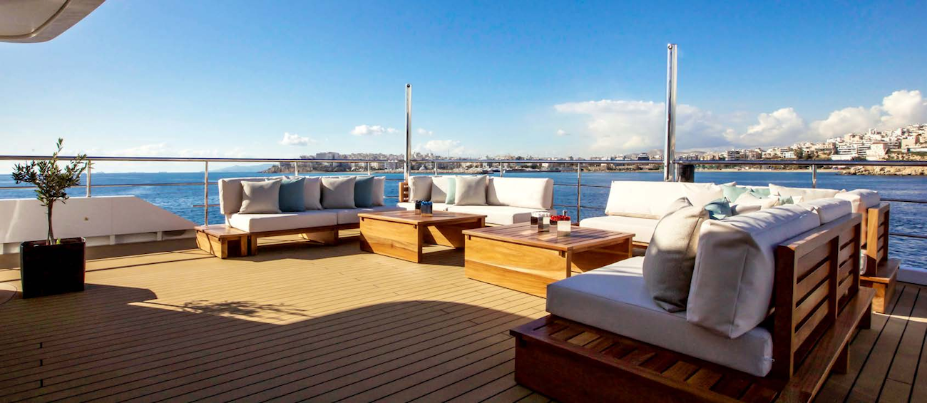 On the upper deck aft, there is a large alfresco dining area in the shade to serve up to 12. Along the stern, two sofas, armchairs and coffee tables create a ...