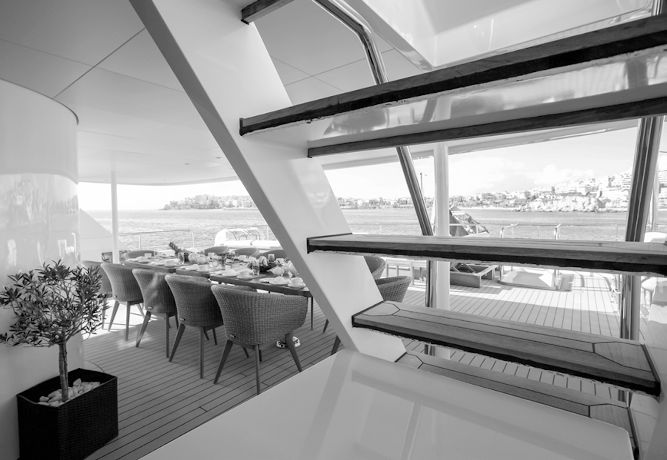 On the upper deck aft, there is a large alfresco dining area in the shade to serve up to 12. Along the stern, two sofas, armchairs and coffee tables create a ...