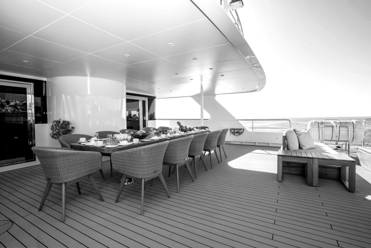 On the upper deck aft, there is a large alfresco dining area in the shade to serve up to 12. Along the stern, two sofas, armchairs and coffee tables create a ...