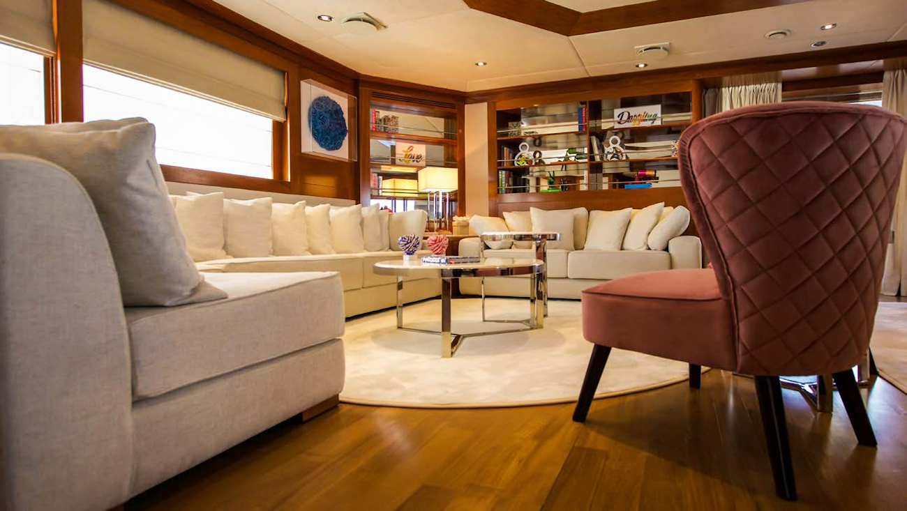 ~ Both double cabins are placed on the main deck and each has a plush armchair and a desk opposite, as well as a widescreen TV.