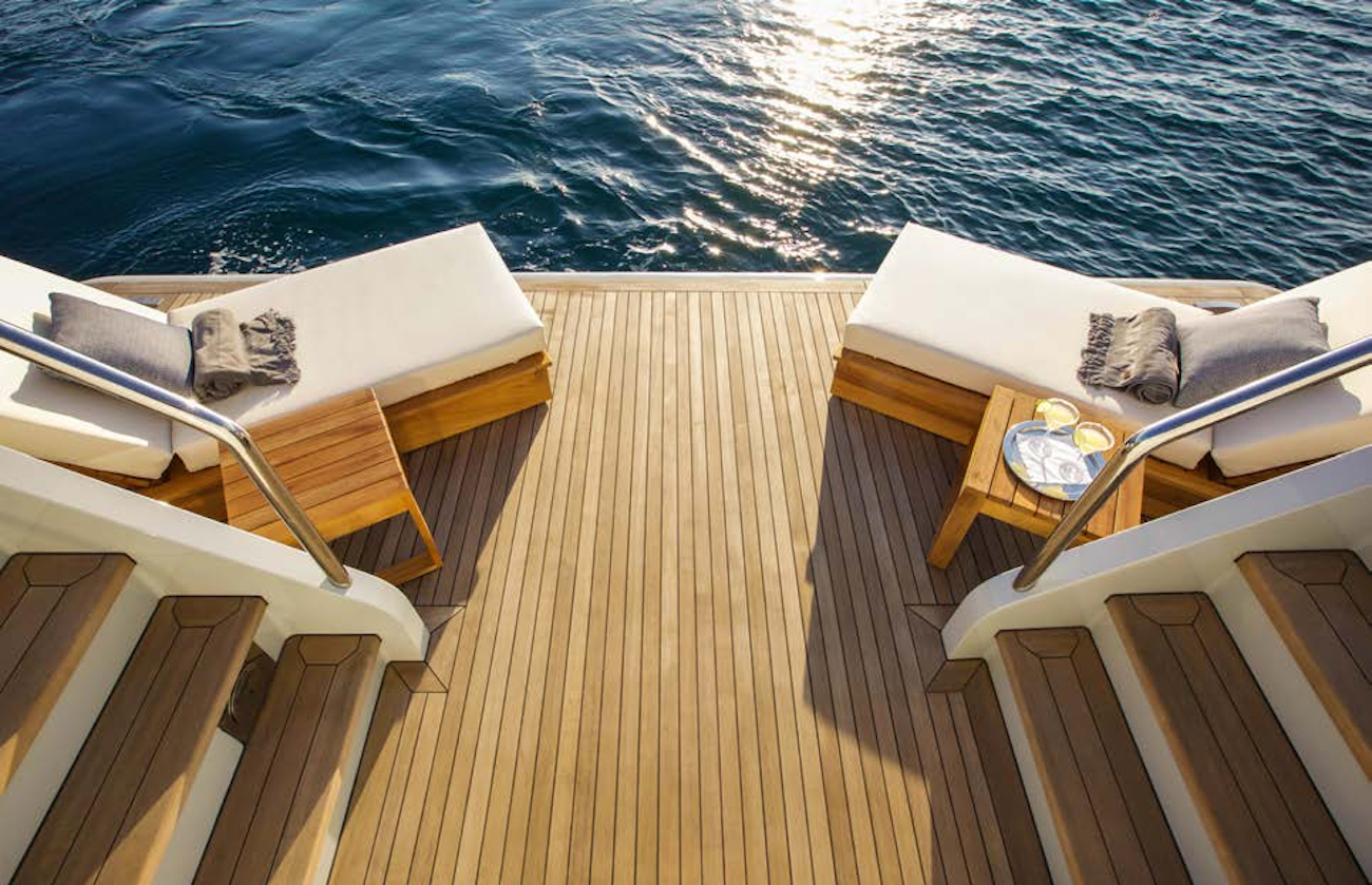 The lower deck swim platform becomes a beach club with a sun lounger to both sides creating a space to rest beside the water.