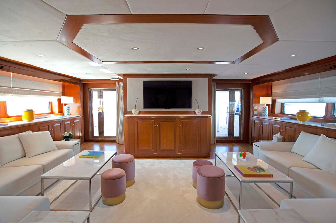 The lower deck swim platform becomes a beach club with a sun lounger to both sides creating a space to rest beside the water.