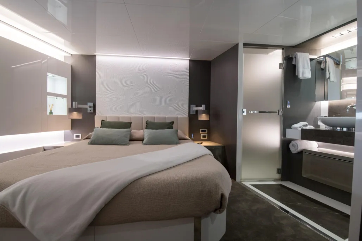 With contemporary styling and spacious deck areas, MARCELLO can accommodate up to eight charter guests in four cabins overnight, with a professional crew of three ensuring everyone has a relaxing time on board.