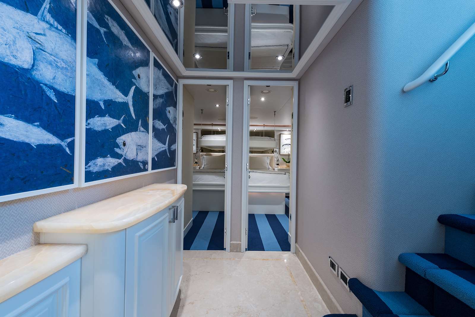The laundry and pantry are placed aft to port of the galley with the main foyer opposite. Behind, the formal dining area is placed forward and seats up to eight guests in elegant surroundings, with a drinks/games table behind to ...