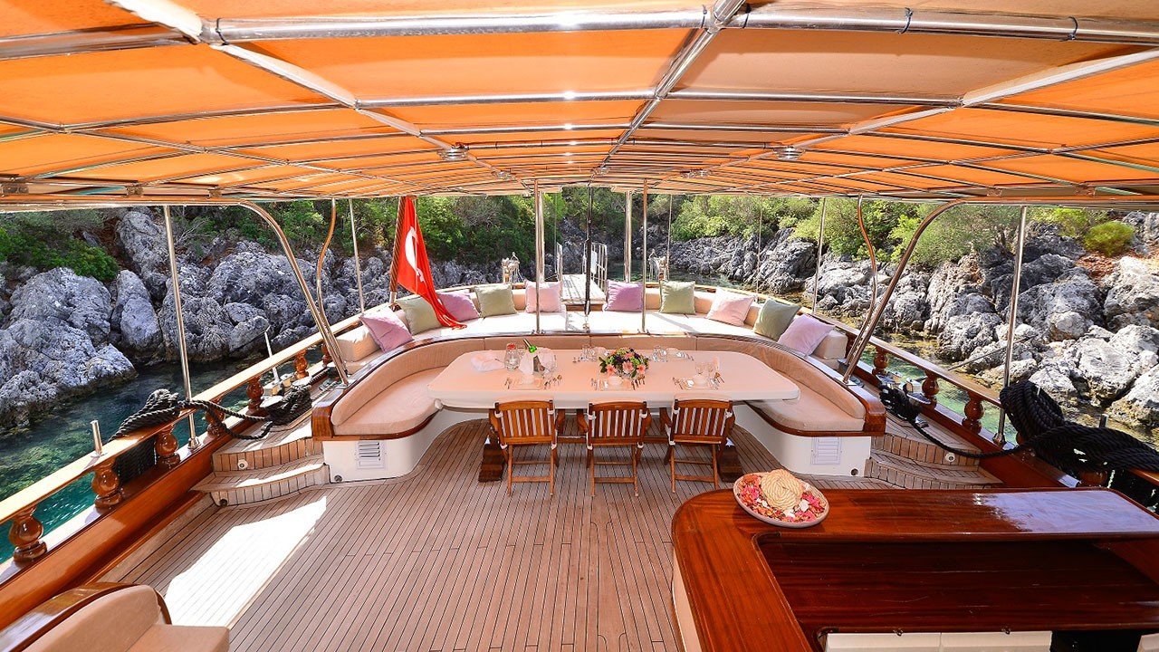 Aft deck offers a spacious lounge and sunbathing area with oversides sunpads and cushions. Alfresco dining area consists of a large table with a sofa and chairs to seat 8 guests.